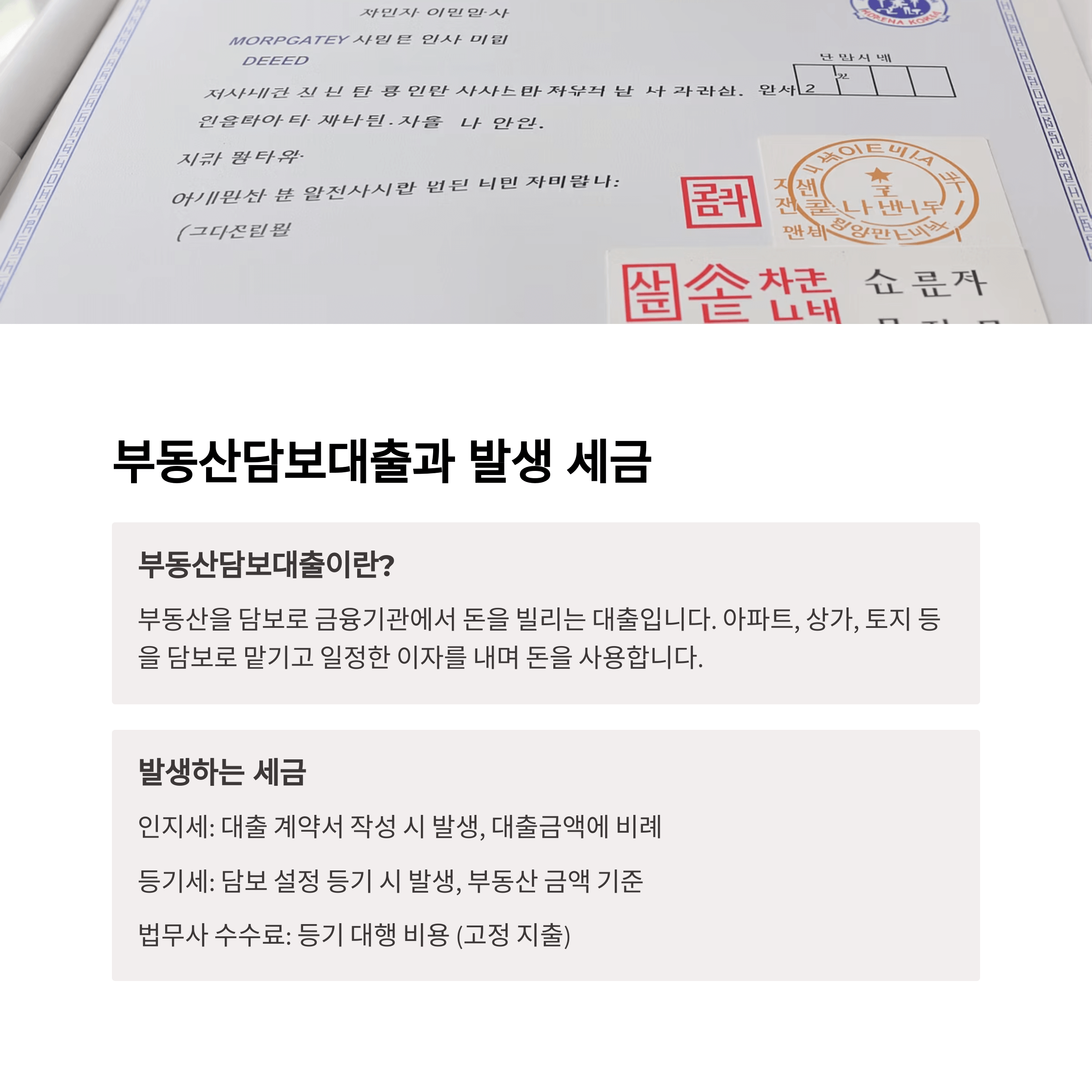 - 등기세: 담보 설정 등기를 할 때 발생하며, 부동산 금액 기준으로 계산됩니다.