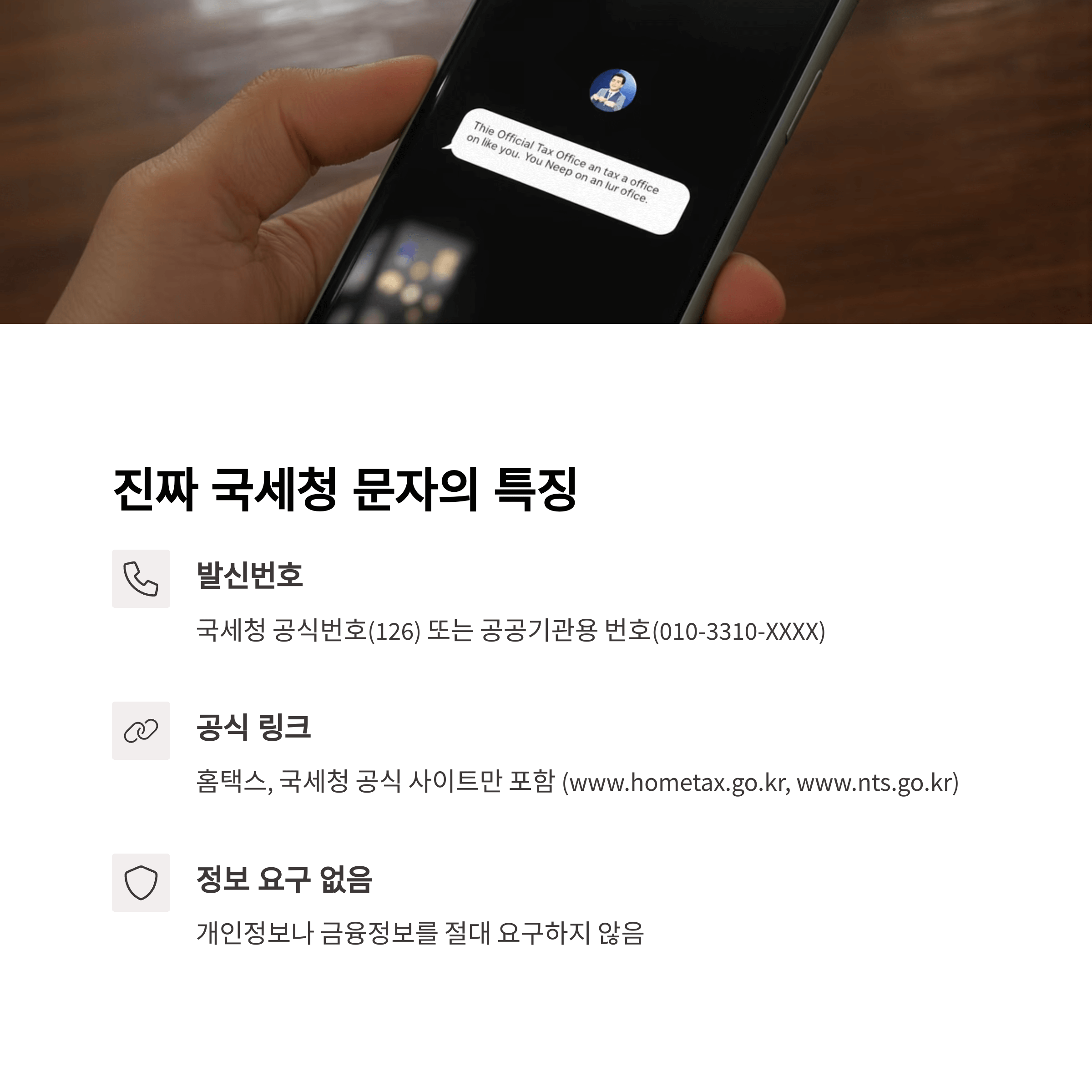국세청은 절대 문자로 개인정보나 금융정보를 요구하지 않습니다. 또한 문자에 포함된 링크를 클릭하게 유도하는 경우가 드물며, 대부분의 경우 정확한 절차 안내만 포함됩니다.