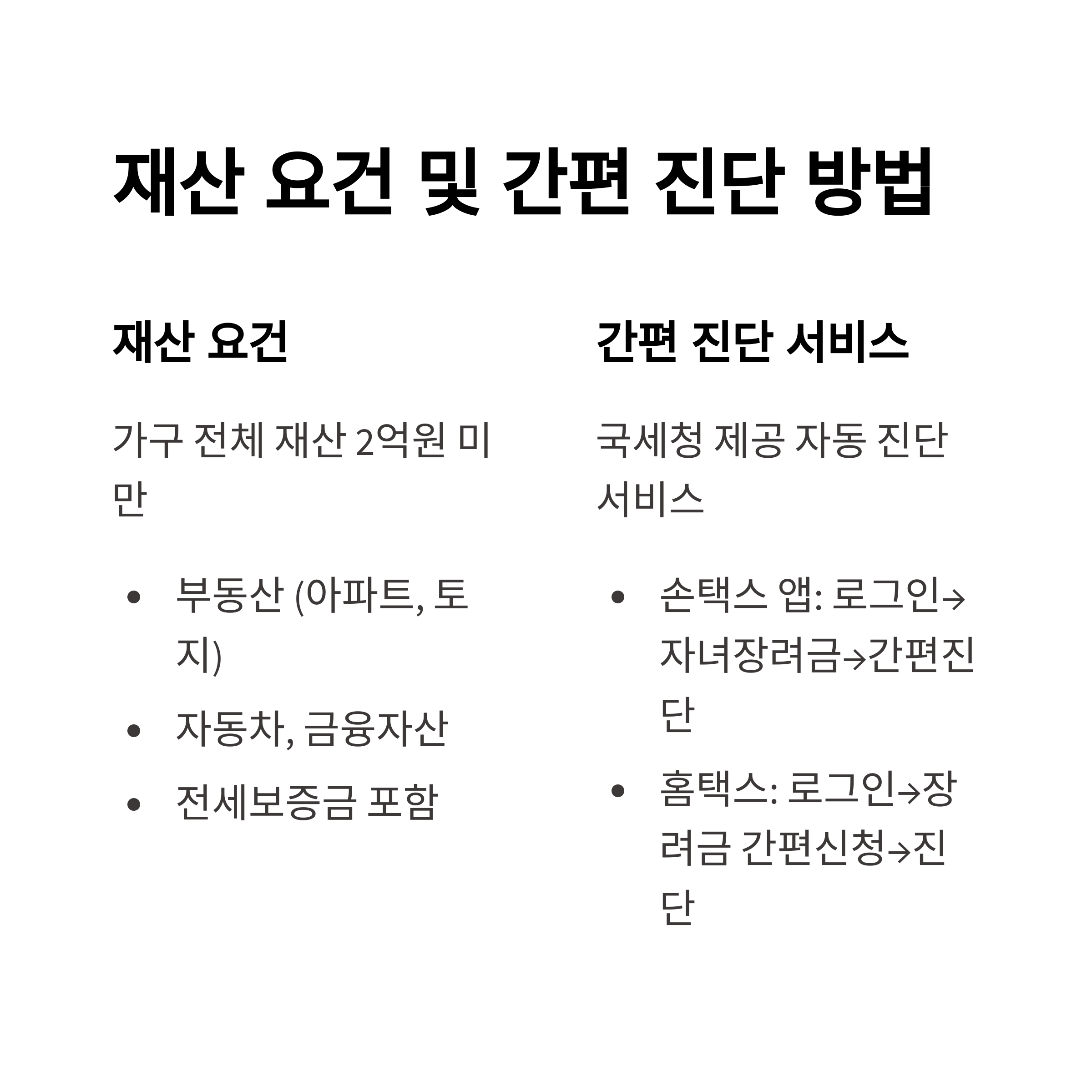 총소득 요건 외에도 가구 전체 재산이 2억원 미만이어야 자녀장려금을 받을 수 있습니다.