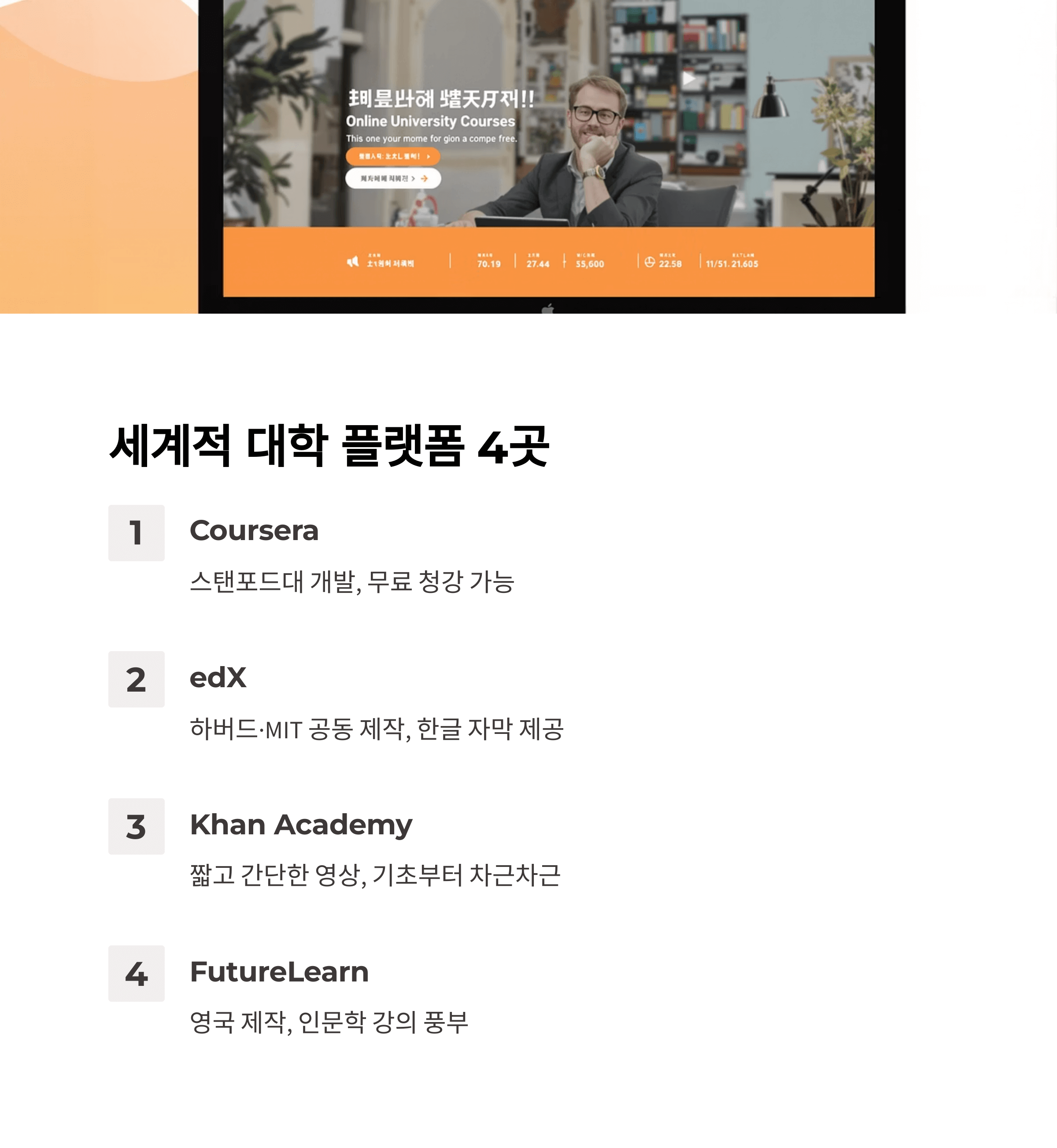 하버드와 MIT 같은 세계적인 학교가 함께 만든 플랫폼입니다. 책 대신 영상 강의를 보고, 간단한 퀴즈나 문제로 복습도 할 수 있습니다. 특히 노후에도 공부를 계속하고 싶은 분께 추천드립니다. 한글 자막이 있는 경우도 많아 이해가 편합니다.