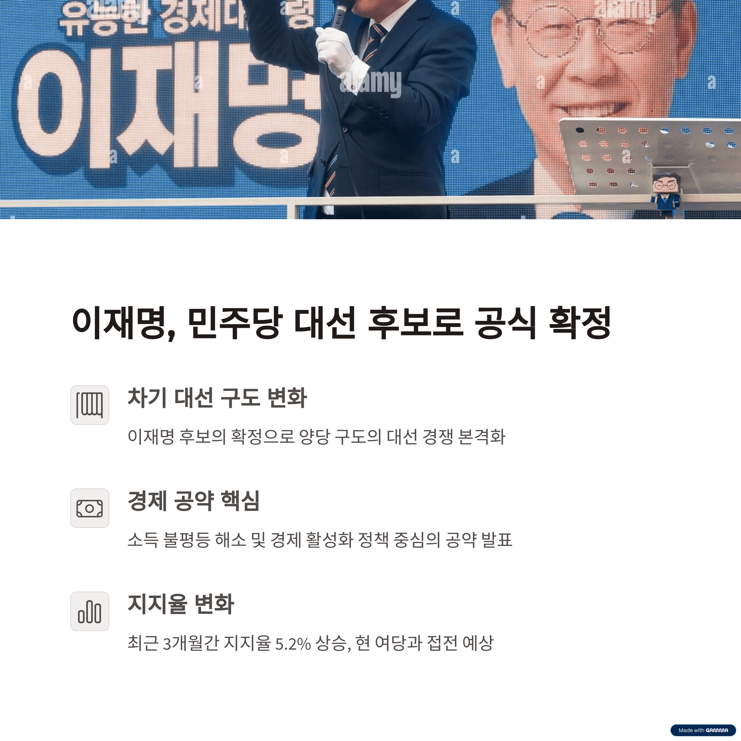 이재명 전 대표가 민주당 대선 후보로 공식 확정되었으며, 1987년 민주화 이후 민주당 계열 대선 후보 경선 역대 최고 득표율인 89.77%를 기록했습니다. 국민 통합과 내란 극복, 경제 회복을 주요 공약으로 내세우고 있습니다.