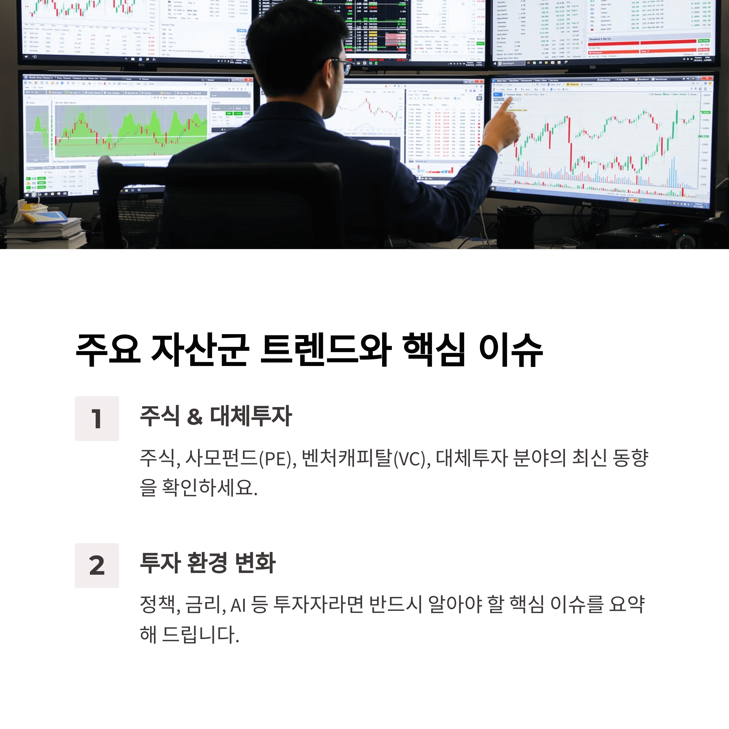 - 주식, 사모펀드(PE), 벤처캐피탈(VC), 대체투자(Alternative Investments) 등 주요 자산군의 최신 트렌드를 다룹니다.