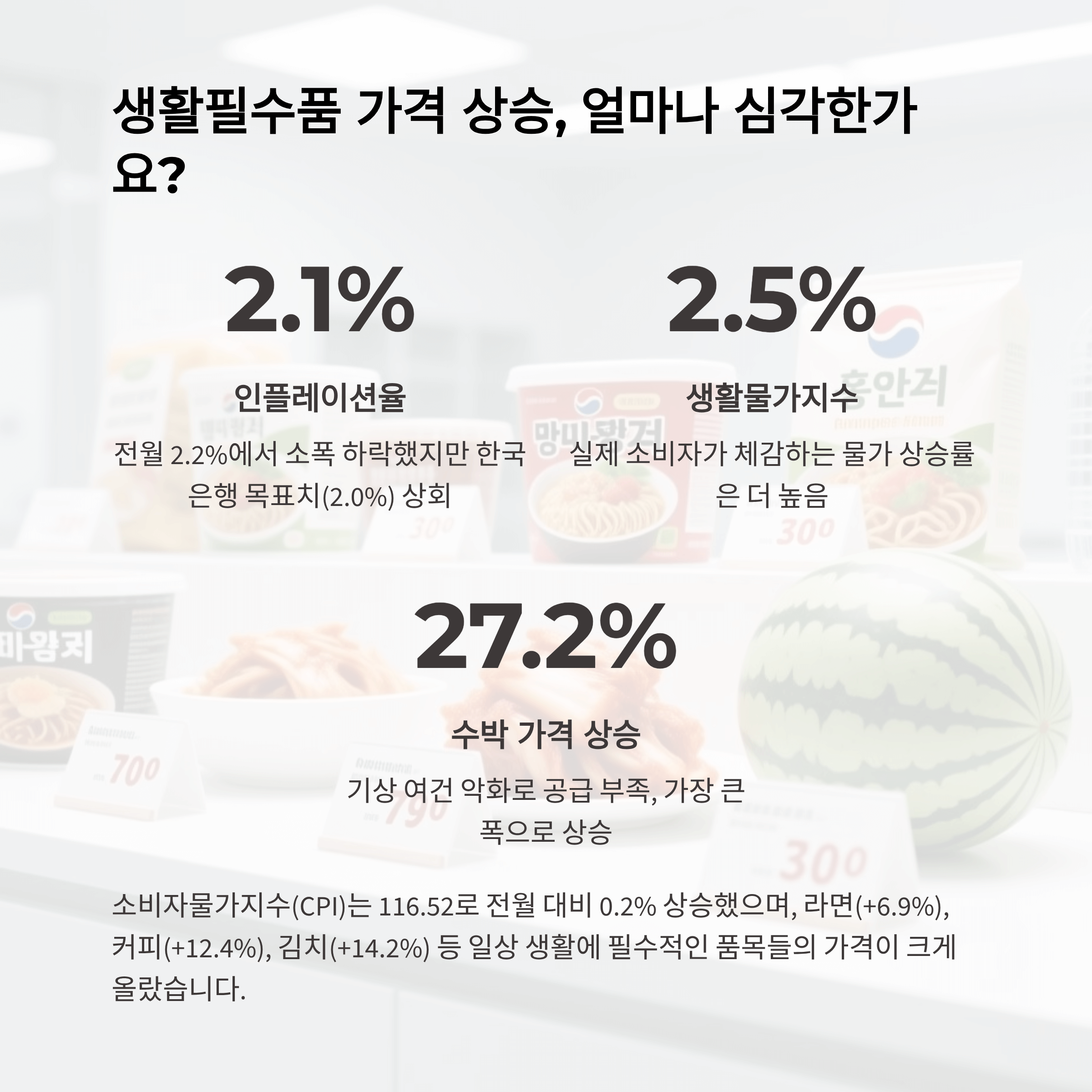 의미: 전반적 물가는 안정세지만, 생활필수품 중심의 체감 물가는 여전히 높은 압박을 주고 있습니다.