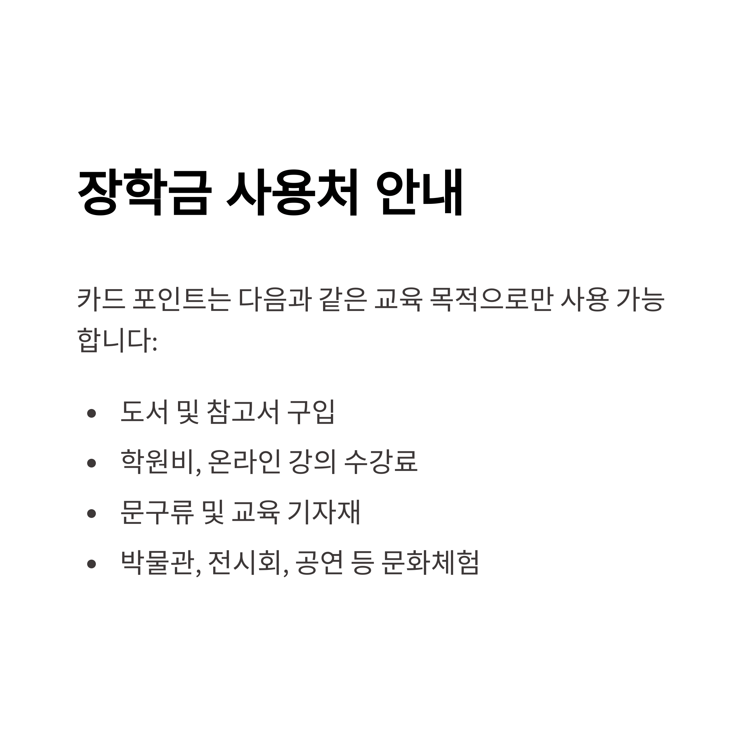 장학금은 카드 포인트 형태로 지급되며, 사용은 교육 목적에 한정됩니다.