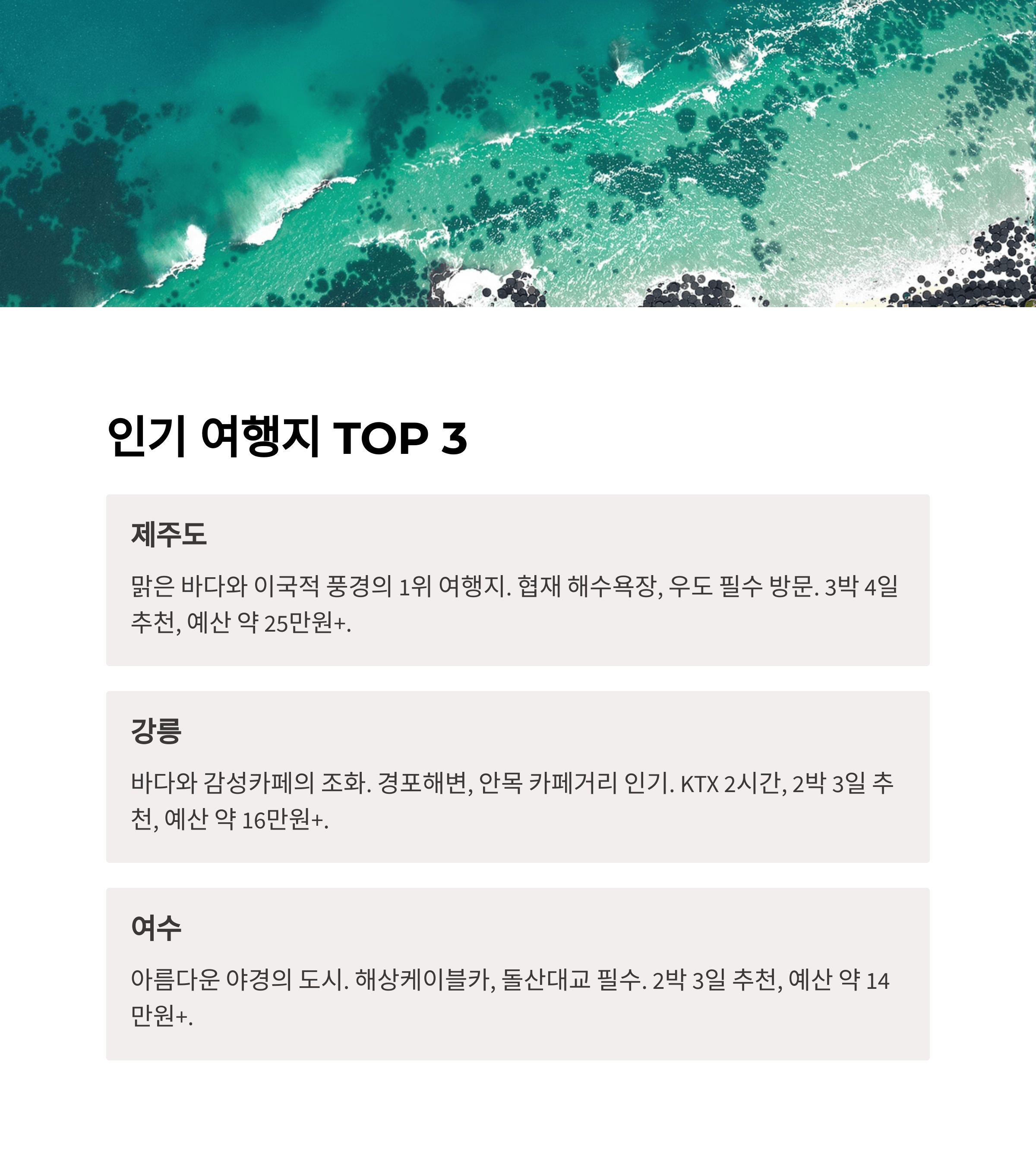 • 이 글에서는 2025년 기준, 가장 사랑받는 여름 국내 여행지와 각 여행지의 매력 포인트, 예산, 추천 일정까지 정리해드립니다.