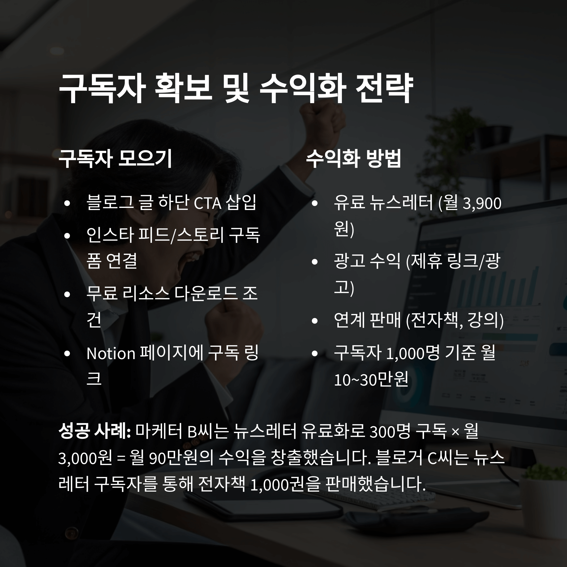 마케터 B씨: 뉴스레터 유료화 → 300명 구독 x 월 3,000원 = 월 90만 원