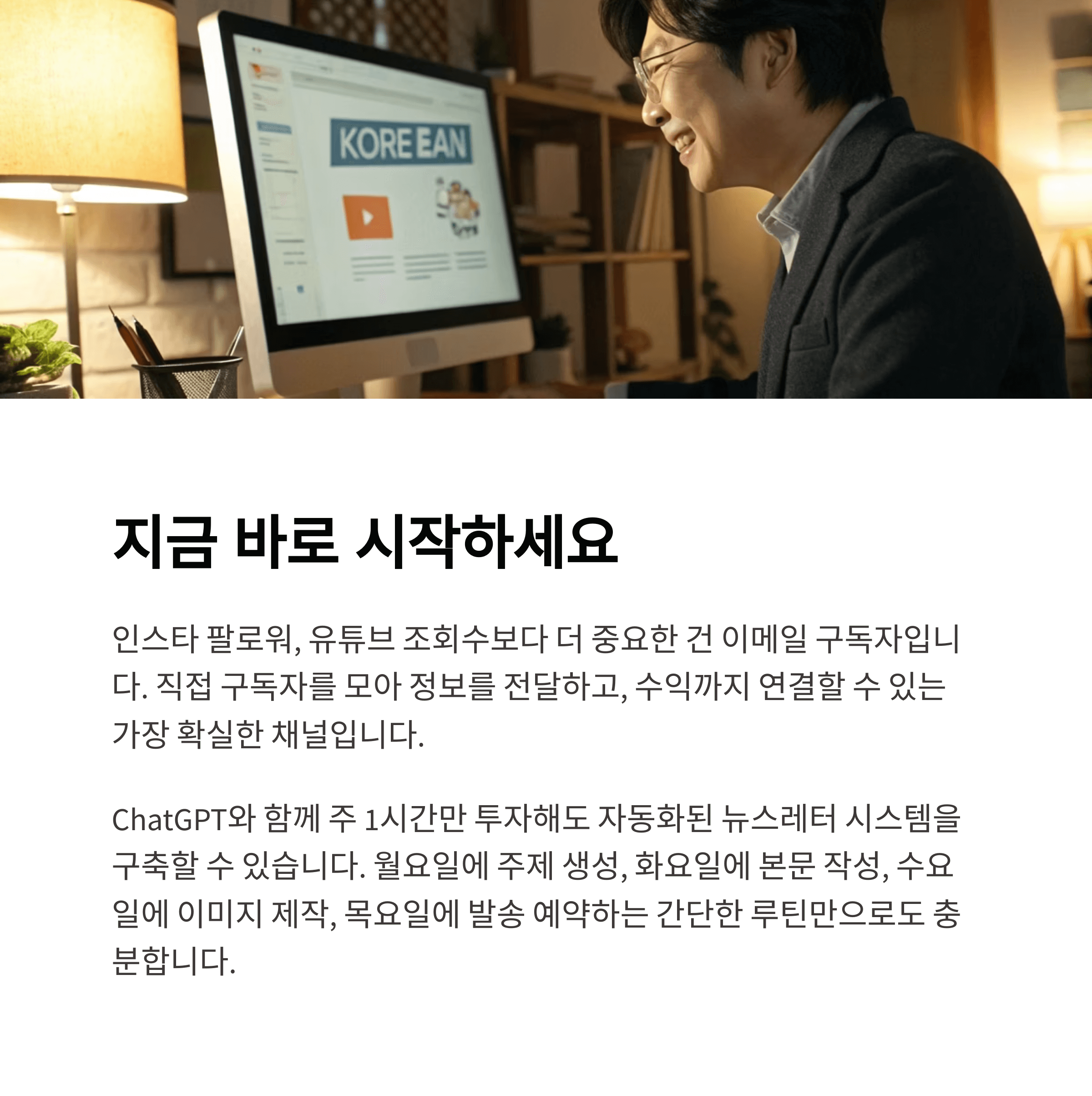인스타 팔로워, 유튜브 조회수보다 더 중요한 건 이메일 구독자입니다. 직접 구독자를 모아 정보를 전달하고, 수익까지 연결할 수 있는 가장 확실한 채널. 지금 당장 ChatGPT와 함께 뉴스레터를 시작해 보세요.