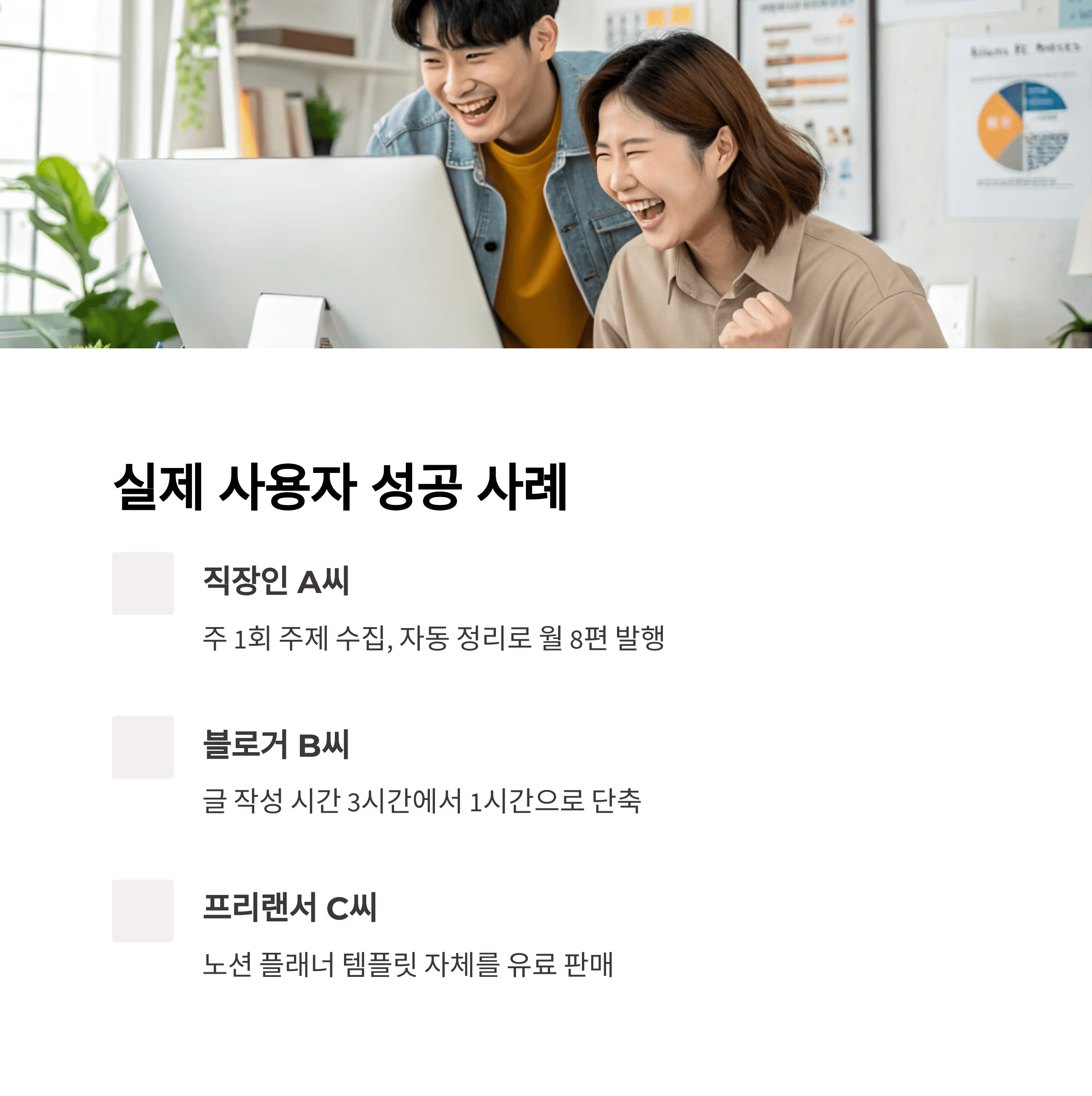 ✅ 직장인 A씨: 주 1회 주제 수집, Notion에 자동 정리 → 월 8편 발행
